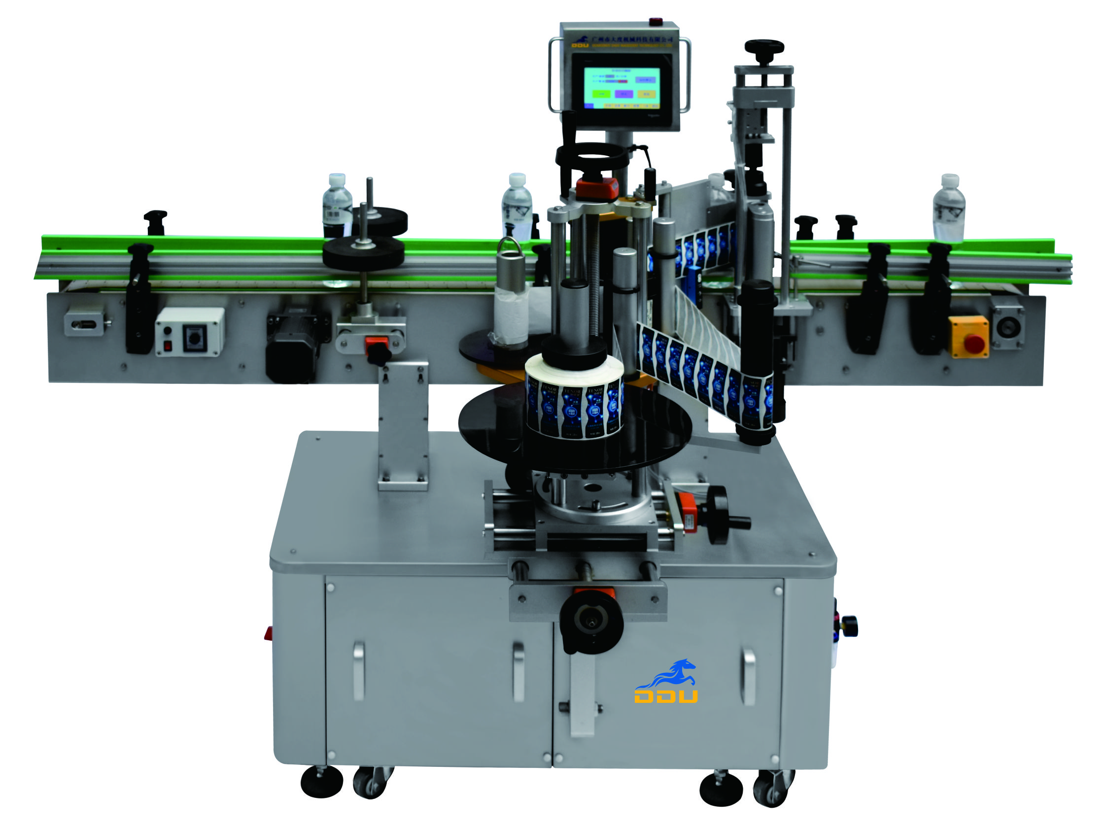 DDU-1603 立式圓瓶定位貼標(biāo)機(jī) 適用范圍:用途廣泛!主要適用于醫(yī)藥、日化、食品等行業(yè)的圓柱形包裝容器或小錐度的圓錐形包裝容器的單標(biāo)、雙標(biāo)自動定位貼標(biāo).該機(jī)拓展性強(qiáng)!可選配各類打印機(jī)完成在線實(shí)時打印,可單機(jī)使用,亦能連接生產(chǎn)線使用 主要性能結(jié)構(gòu)特點(diǎn):1、中英文觸…